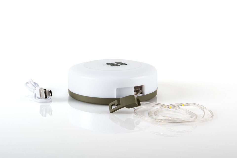 Mit USB-Anschluss (USB-Kabel enthalten). Die ausziehbare Lichterkette hat ca. 10 Meter. Das LED Outdoor Campinglicht hat 3 verschiede Hellichkeitsstufen, kann blinken und hat ein SOS Rotlicht.